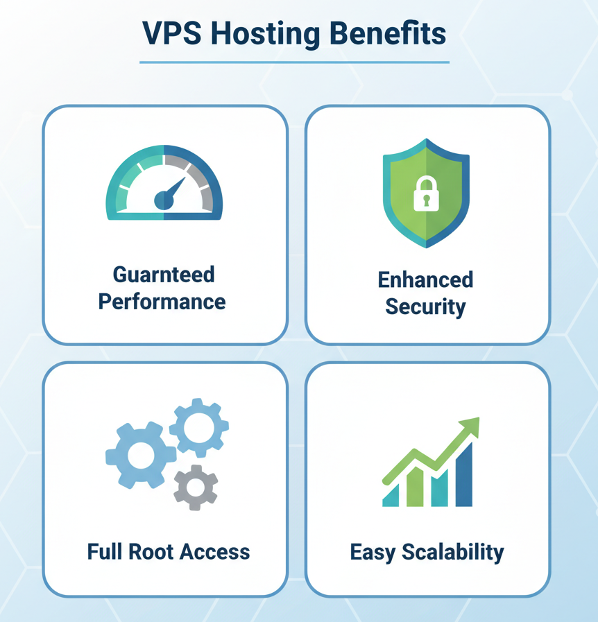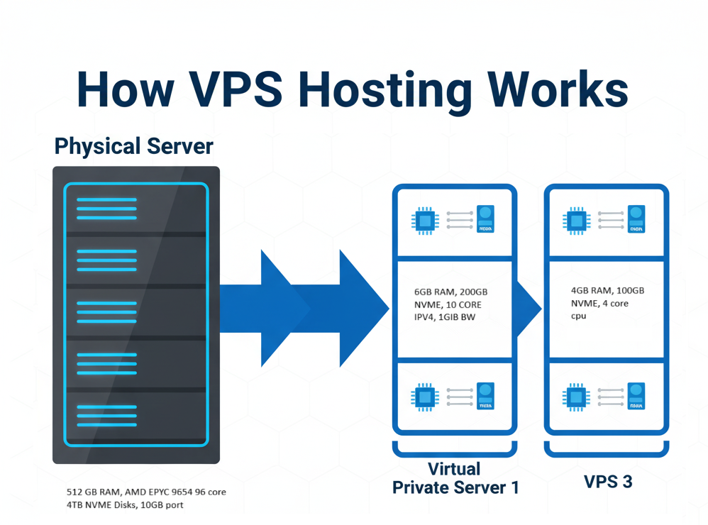 This is precisely how VPS hosting works. A powerful physical server splits into multiple virtual servers using sophisticated virtualization technology. Therefore, each VPS gets its own guaranteed resources (CPU, RAM, storage) and a dedicated operating system. Ultimately, it offers you the control of a dedicated server at a fraction of the cost.